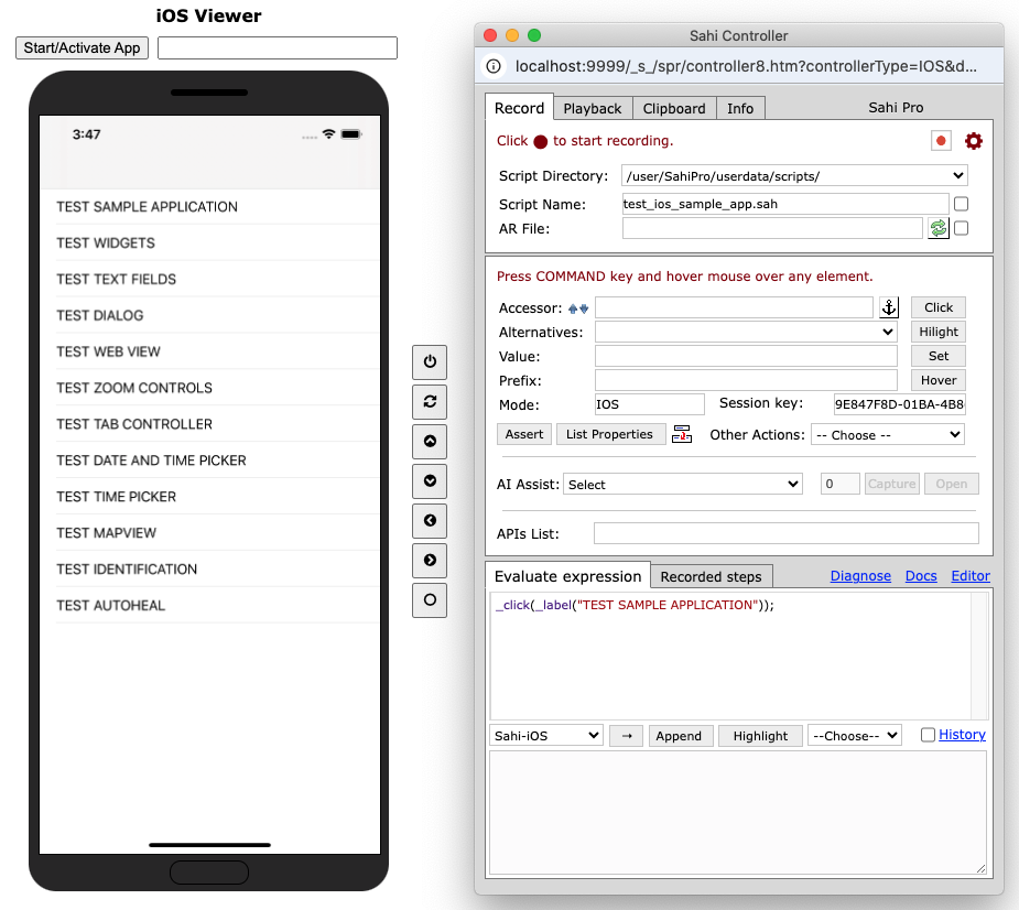 - Specify a script name (test_ios_sample_app.sah) in the Controller and click on