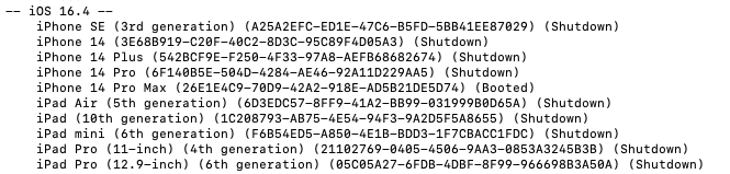 NOTE that your Simulator UUIDs will be different. - From the output, locate the