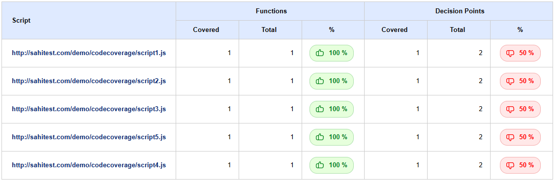 infoIf the percentage of function covered is below 50% then it appears in red colour otherwise it appears in green colour.