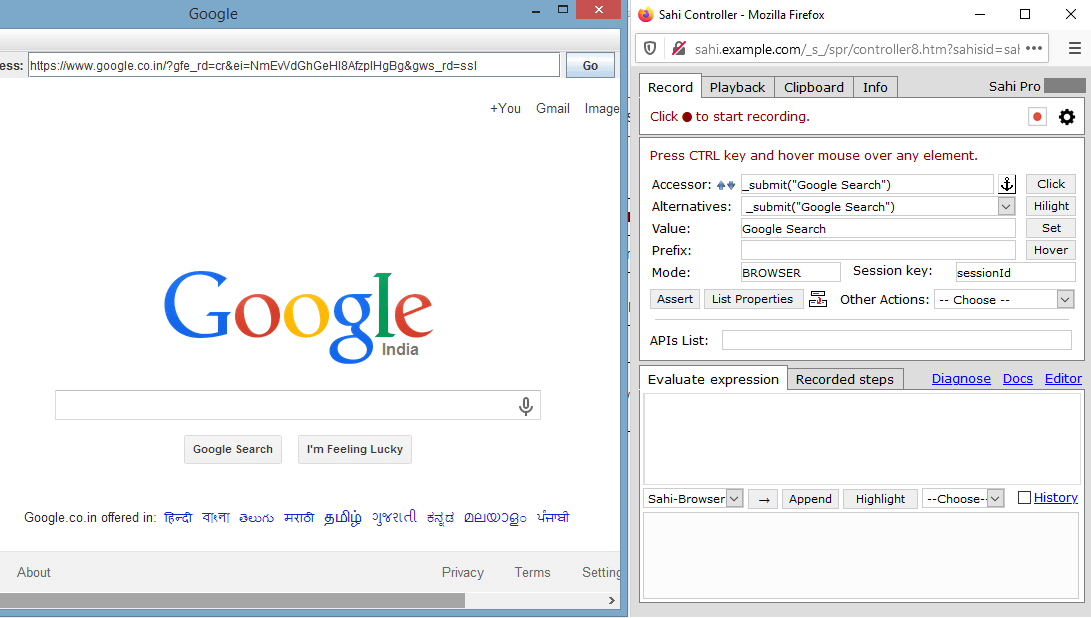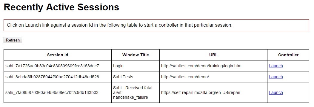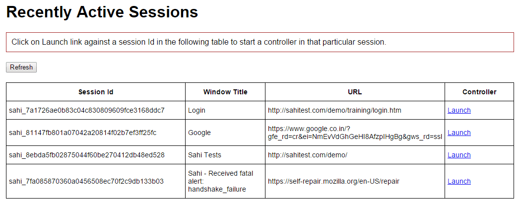- Once the browser from CEF is listed(use the window Title and URL to determine the right browser), click on launch link on Active Sessions page to launch a controller for CEF browser. This controller will allow record and playback on the CEF browser.