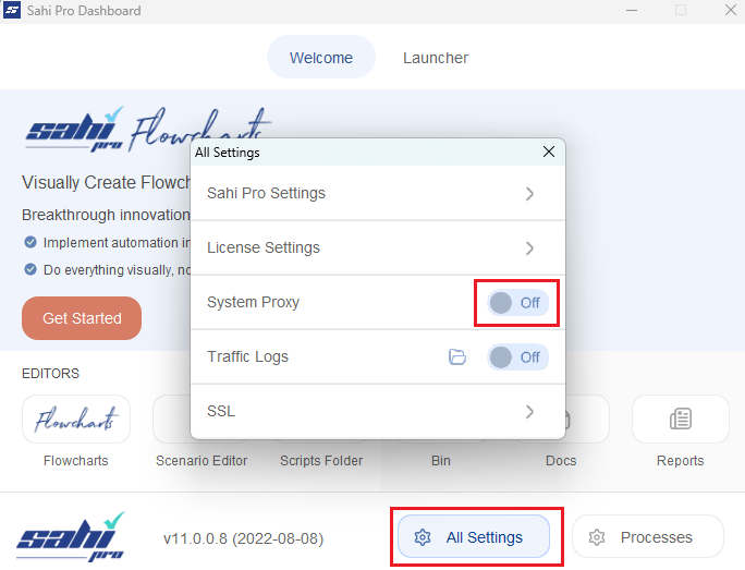 All Settingsbutton on the dashboard and then Turn on system proxy from settings dialog.