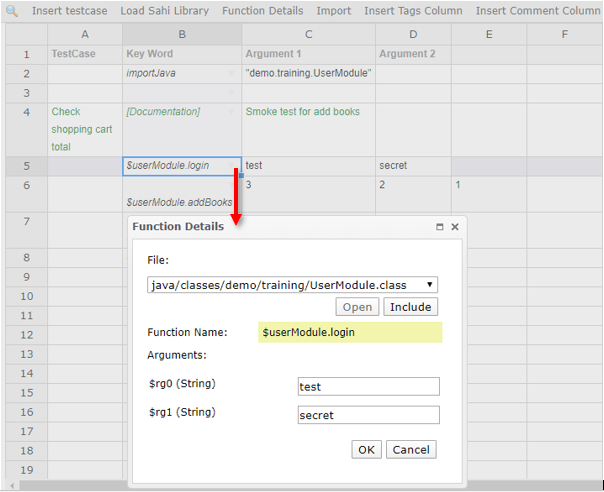 The UI contains a button on the top of the editor called "Function Details". Selecting a cell and clicking this button gives details of the selected function and its arguments. This gives a basic idea as to what the type and number of arguments are.