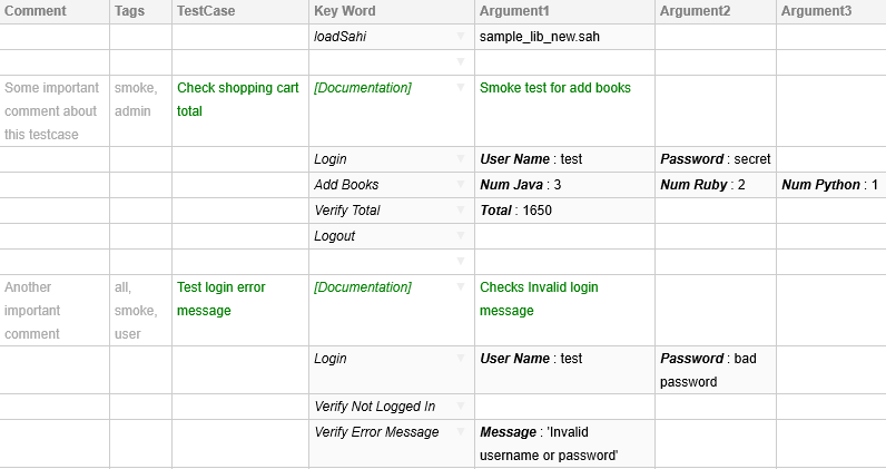 The column after TestCase is the Key Word column. It holds keywords. Keywords are mapped to functions in the included Sahi script.