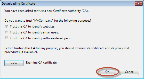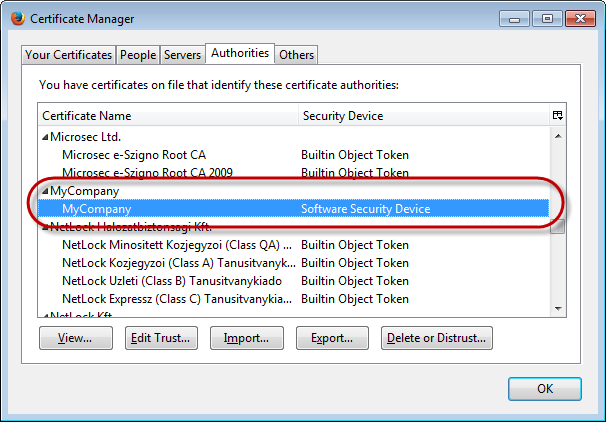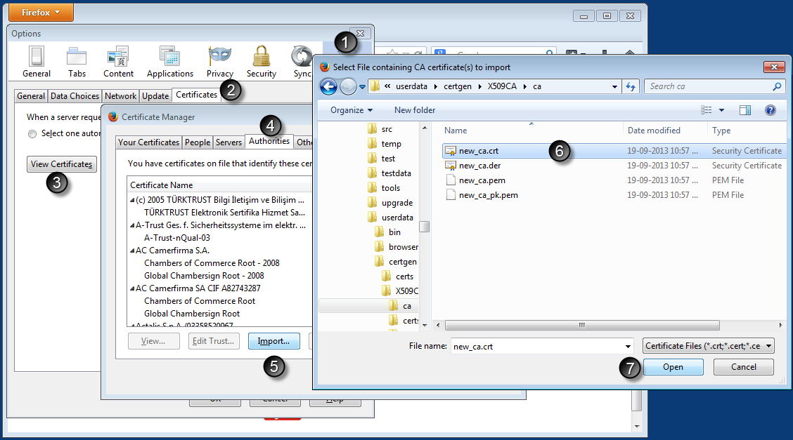 Once created, the root certificate needs to be accepted on different browsers. The procedure is the same as specified in Configure SSL. However, firefox needs to be configured additionally.Configuring Firefox template for new root certificate